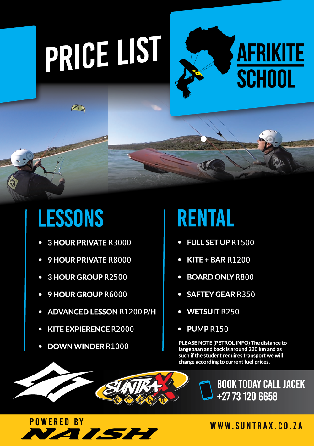 (Over 3 separate days, or sessions) All gear provided, just bring sunblock and water. PLEASE NOTE (PETROL INFO) The distance to langebaan and back is around 220 km and as such if the student requires transport we will charge according to current fuel prices.